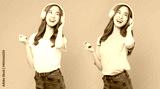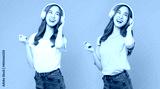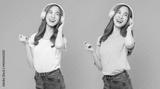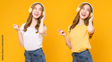 Cheerful young Asian woman in headphones listening to music and enjoy favourite playlist application with dancing on orange background.
