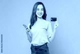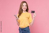 Cheerful beautiful Asian woman holding smartphone and mockup credit card on pink background.