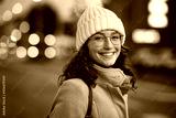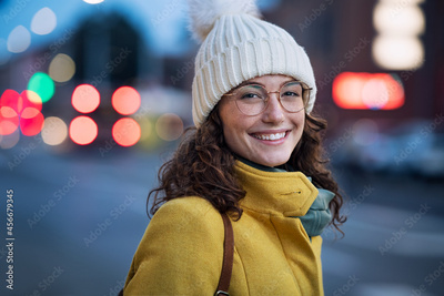 Smiling woman on street during winter dusk
