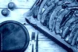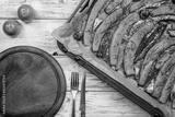 Baked pumpkin hokkaido and vegetable on wooden plate. Roasted vegetable as autumn dinner. Setting the dining table