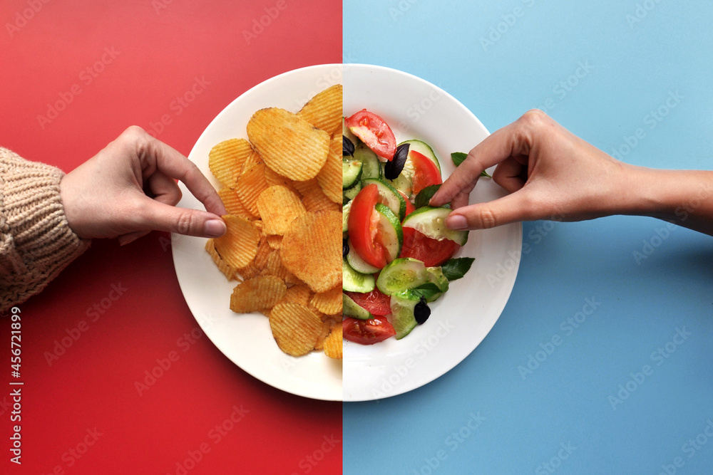 a plate of chips and a fresh salad. A person chooses between healthy and unhealthy food