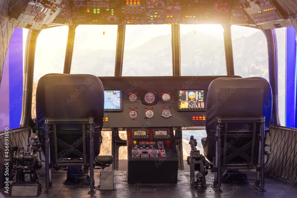 Flight simulator, cockpit seats and control panel.