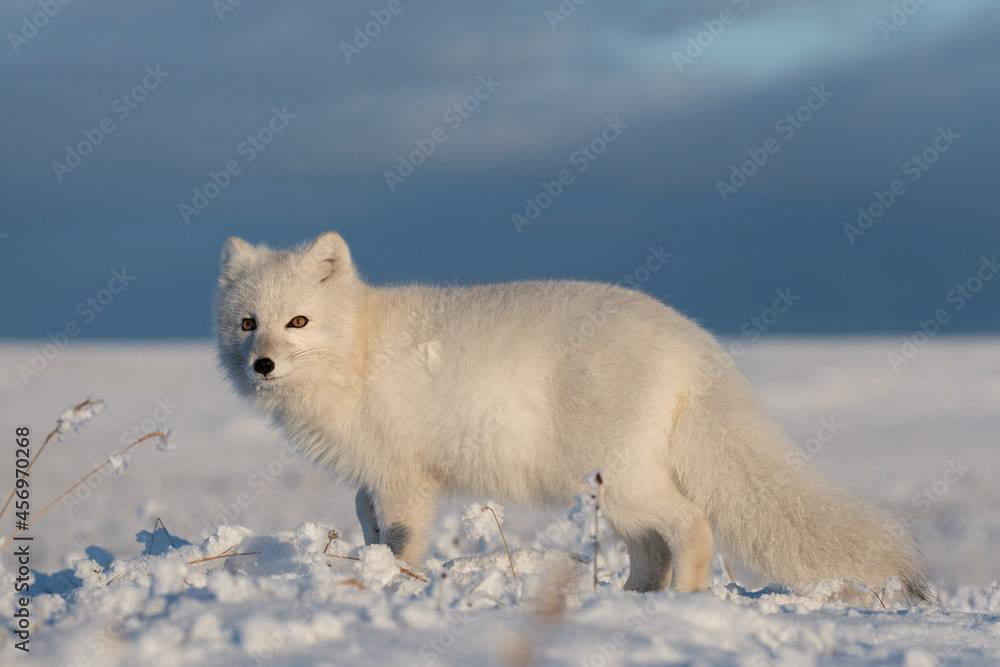 Wild arctic fox (Vulpes Lagopus) in tundra in winter time. White arctic fox.