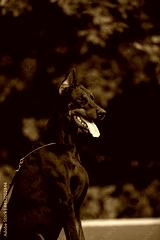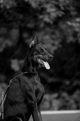 Beautiful dog Doberman Pinscher breed with autumn forest