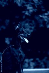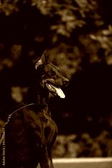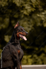 Beautiful dog Doberman Pinscher breed with autumn forest