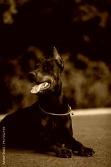 Beautiful dog Doberman Pinscher breed with autumn forest