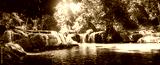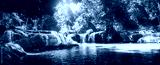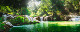 Wide panorama beautiful green nature view scenic landscape waterfall in tropical jungle rain forest, Attraction famous outdoor travel Saraburi Thailand, Spring background, Tourism destination Asi