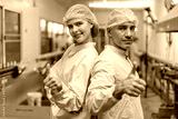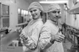 A quality supervisor or a food technician is inside the juice chamber. Employees are happy to work within an industrial facility. Male and female officers dressed in white and wearing hats