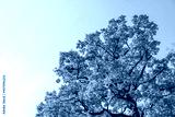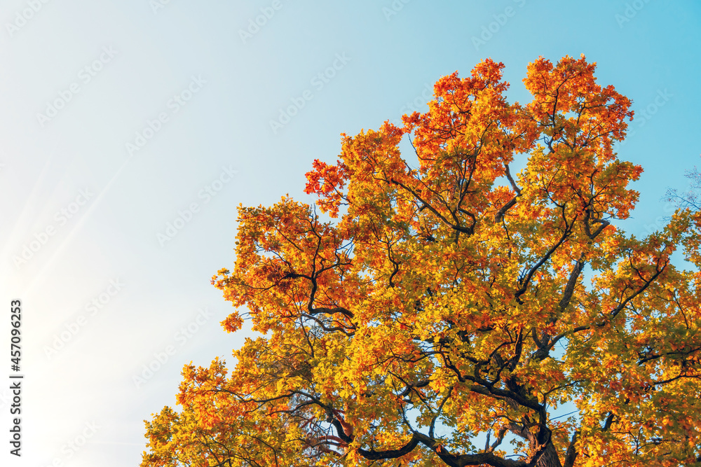 Dense branches of oak in autumn against the blue sky. Leaf fall in the park.