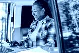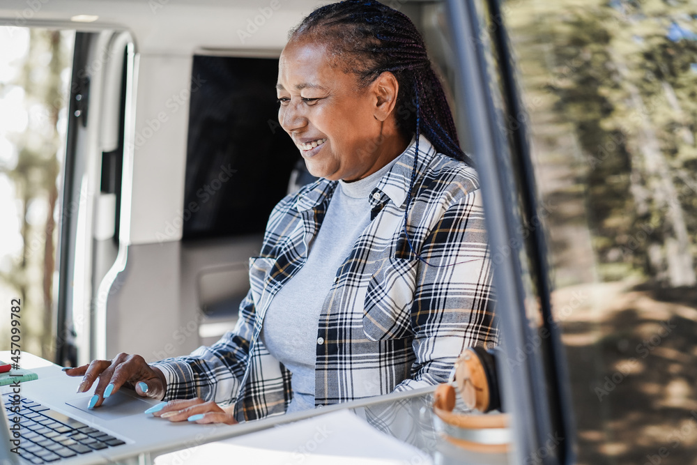 Happy african having fun woman using computer laptop inside mini camper van - Focus on face
