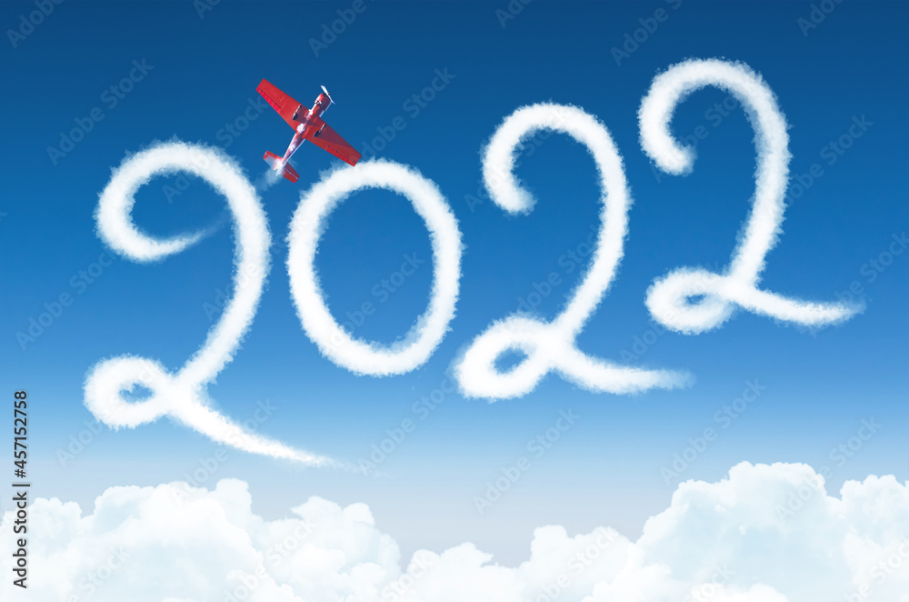 Happy New year 2022 concept on the background below cloudscape. Drawing by passenger light-engine, turboprop airplane white vapor contrail in sky.