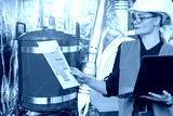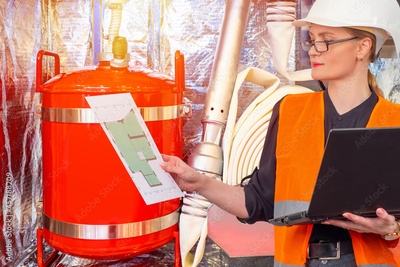 Fire safety. Woman works a fire inspector. Girl checks equipment to extinguish flame. Woman next to extinguishing equipment. Fire inspector with a laptop in his hands. Selling extinguishing equipment