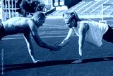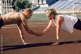 Young couple man and woman doing plank exercises at stadium, abdominal muscles and cortex training