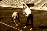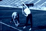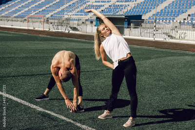 Young people doing sport stretching exercises together at stadium workout, healthy lifestyle concept