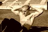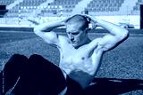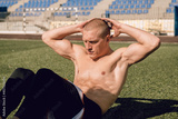 Young man doing crunches exercises at stadium, abdominal and chest muscles training