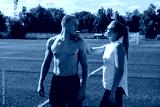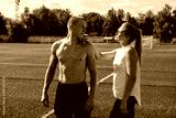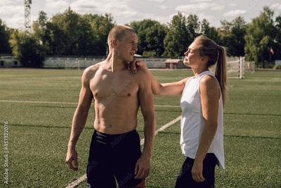 Young couple shirtless man and woman relaxing after workout at stadium, smiling and talking