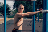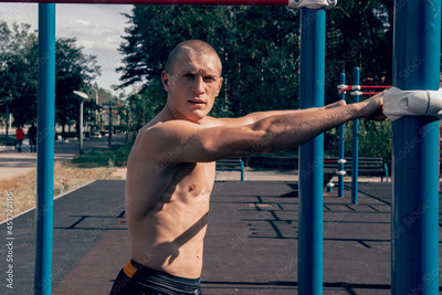 strong trained man athlete posing on the sports field, muscular strong body