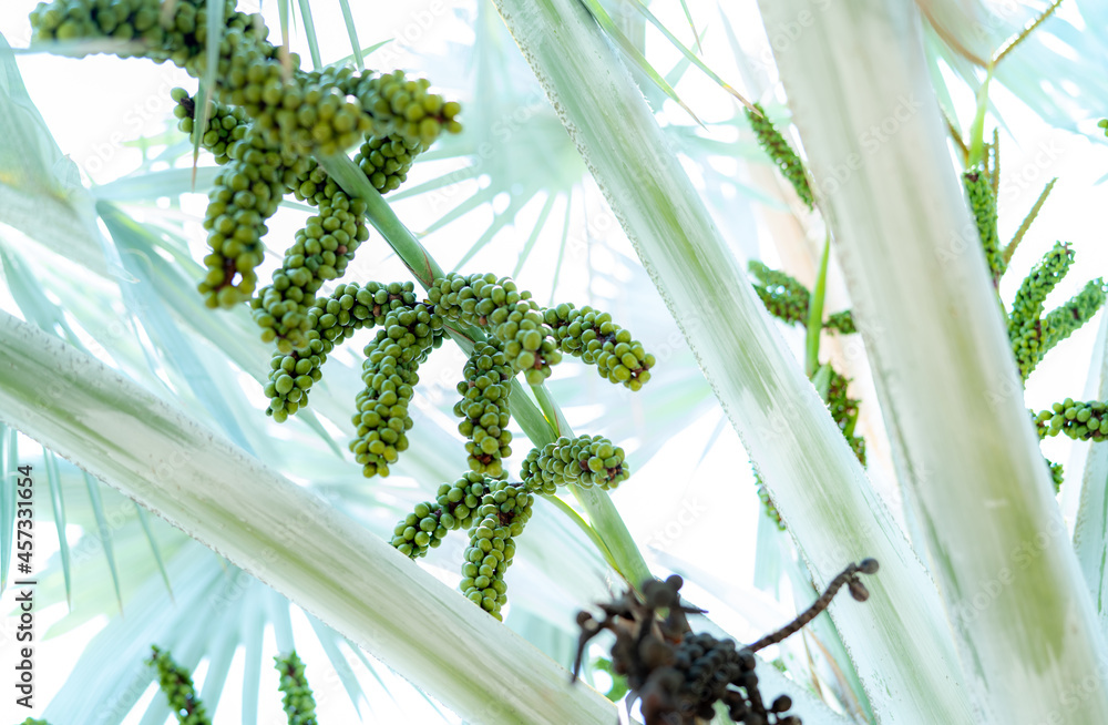 Bismarckia nobilis in the garden. Closeup round green raw fruit of Bismarck palm. Evergreen palm. Palm tree for decorate hotel or resort garden. Ornamental plant. Palm plantation and agriculture.
