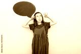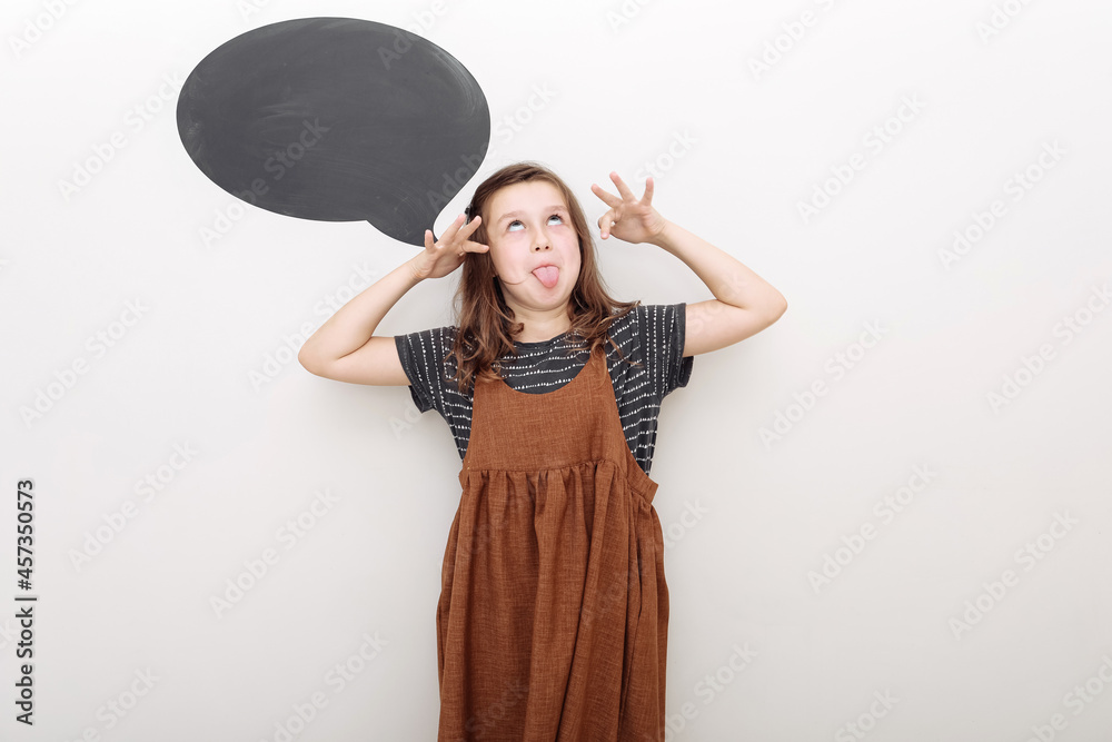 Photo of funny childish teenage girl make funky face stick tongue out isolated on white color background