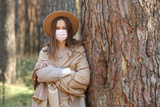 Portrait of young woman wearing hat and protective face medical mask standing in park on sunny day. Virus spread flu prevention quarantine.