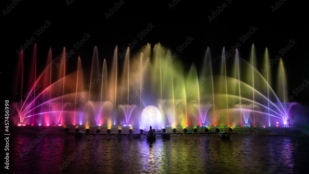 The colorful fountain dancing in celebration festival with dark night sky background.