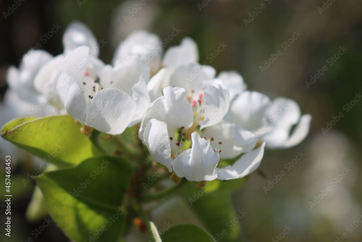 Close-up of white Apple flowers on branch on a sunny day.. Malus domestica