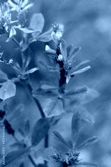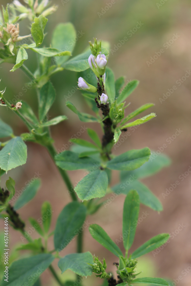 Close-up of Alfalfa plant with purple flowers damagedd by black aphids in the field. Medicago sativa