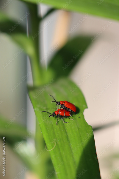 Close-up of Lilioceris lilii insects mating on a green Lily leaf. Red lilies beetle on a plant