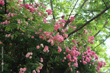 Pink climbing roses on a Persian silk tree flowers also called pink silk tree. Albizia julibrissin in the garden