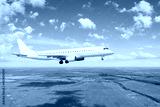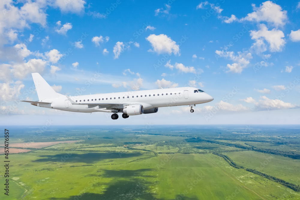 Commercial airplane flying approach with landing gear extended above cloudscape in day sun light.