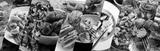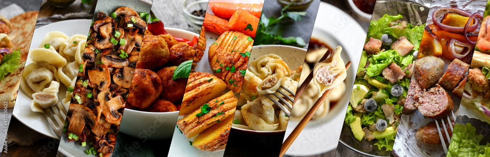 Varied food collage. A varied menu, fish and meat, vegetable.