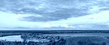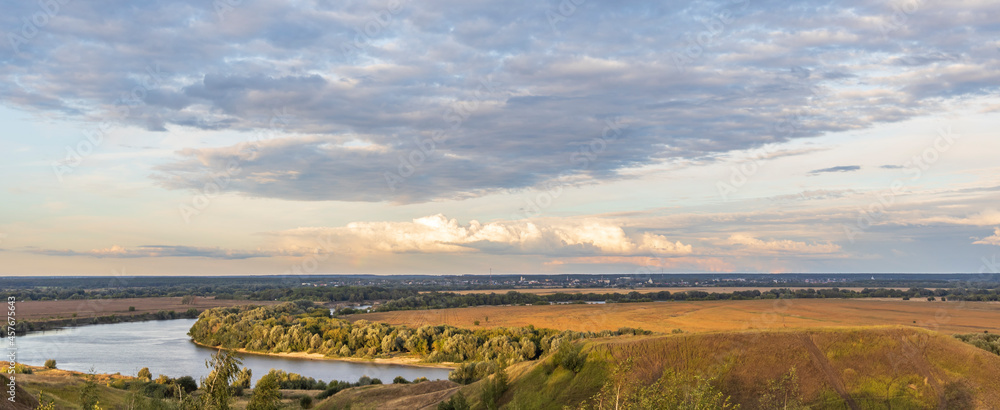 Colorful landscape in the evening, gorgeous blue sky with golden clouds over a field with hills and a river. A magical moment of nature.