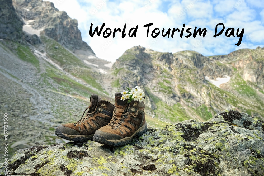 mountains and touristic hiking boots with flowers. world tourism day. mountains summer landscape. atmosphere travel natural background. journey concept