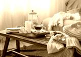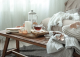 Autumn home composition with tea, candle, book and knitted elements.