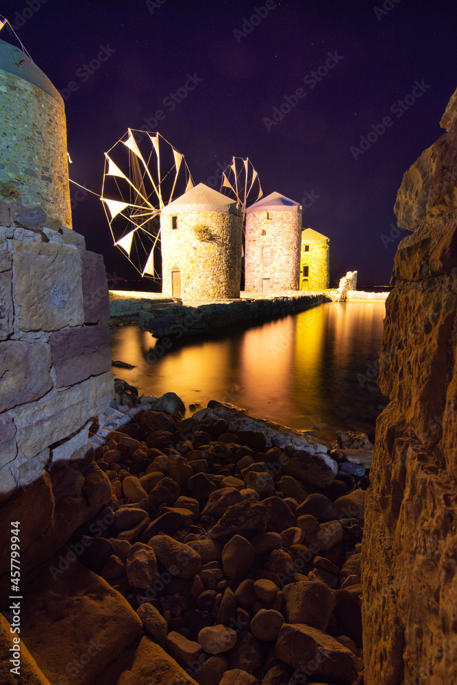 Old windmills by the beach, Chios island, Greece