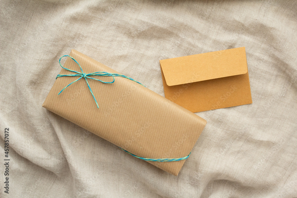 ベージュの背景とプレゼントとオレンジ色の封筒