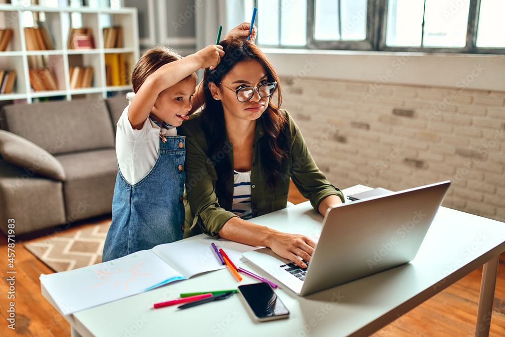 Business woman and mom try to work at the laptop when her little daughter is playing, fooling around and interfering with her. Freelance, work from home.