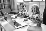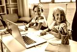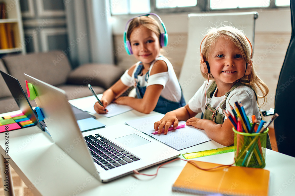 Online training. Two schoolgirl sisters in headphones listen to lessons on laptops. School at home in a pandemic and quarantine.
