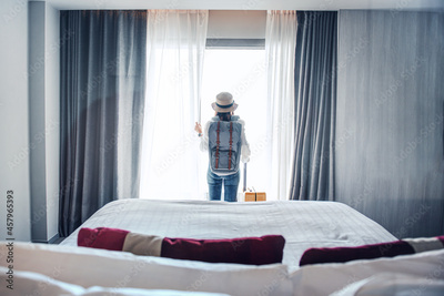 Tourist woman with luggage in hotel after check-in. Conceptual of travel and vacation.