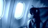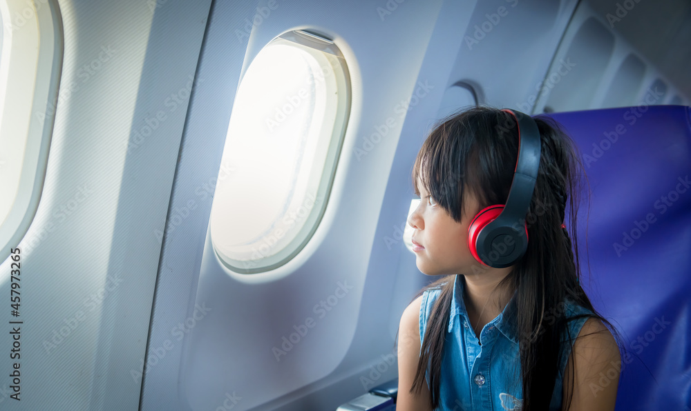 Young tourist girl passenger flight seat near window using smartphone app relax litsening music bluetooth headphones noise-cancelling using wifi internet connection on board.