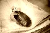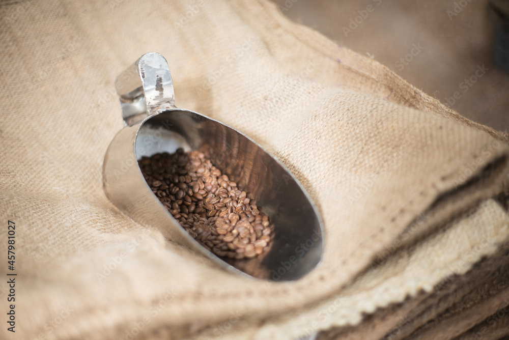 Close-up of roasted coffee beans in scoop. Fresh aromatic coffee ready for sale. Bags made of burlap. Production, industry, manufacturing process concept