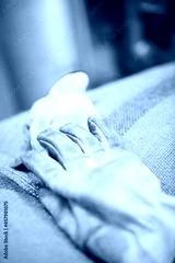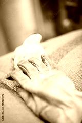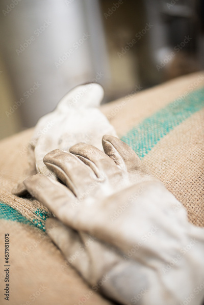 Close-up of coffee bag with glove on it. Bag made from burlap. Workman or workwoman glove. Production, industry, manufacturing process concept