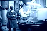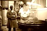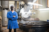 Portrait of mid adult coffee roaster at work. Interior of coffee production workshop with set up roasting equipment. Person with folded hands in uniform and mask. Production, food concept