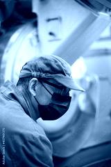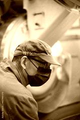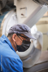Close-up of focused coffee roaster at work. Side view of coffee roaster working on roasting equipment. Man in face mask looking at machinery. Job, factory, maintenance concept
