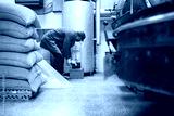 Man in uniform setting up roasting machine. Coffee roaster working on roasting equipment. Man in mask and uniform Working with machinery appliance. Job, factory, maintenance concept