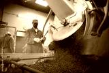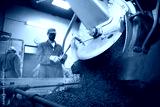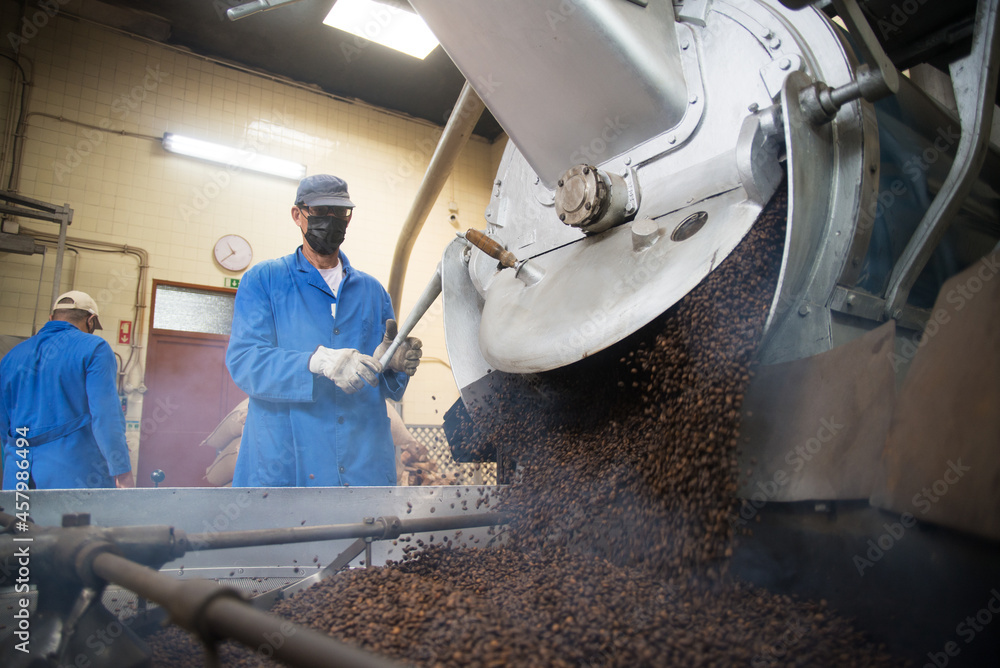 Man working with roasting machine. View of coffee roaster working on roasting equipment. Man in mask and uniform Working with machinery appliance. Job, factory, maintenance concept