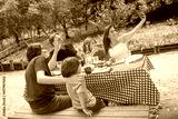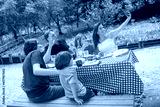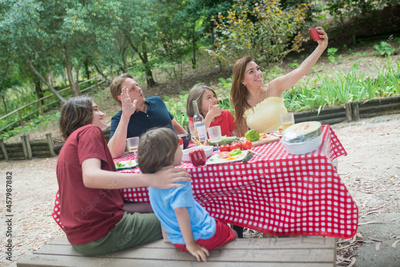 Happy smiling family taking selfie at picnic. Mid adult parents sitting around table with sons, waving at mobile phone, taking pictures. Family time, outdoor activity, social media concept