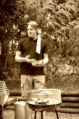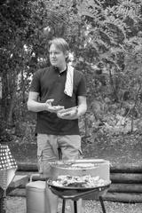 Portrait of concentrated man making BBQ. Mid adult father standing at barbeque grid, cooking fresh meat. Family time, outdoor activity, picnic concept