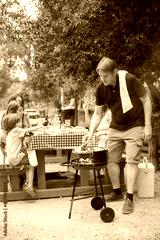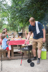 Portrait of happy father making BBQ. Mid adult man standing at barbeque grid, cooking fresh meat. Wife and children eating and talking. Family time, outdoor activity, picnic concept