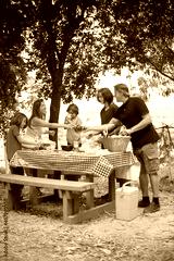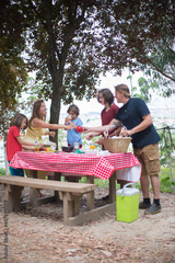 Happy family setting table for picnic. Mother, father and children getting ready for meal at open air, putting food and appliances at table. Family time, outdoor activity, picnic concept